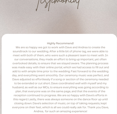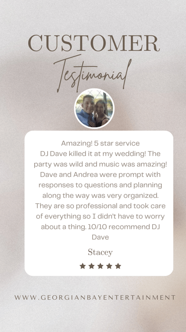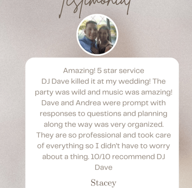 We believe music is the lifeblood of every event. Big or small we do it all. We offer an online music planner for our clients, which enables us to get to know your desired genres, timeline, and integral details. Our DJ Dave meets with you by phone, in person, or by zoom. The success of your event is always our top priority. What you see is what you get, when you book DJ Dave, he is your DJ for your event.
